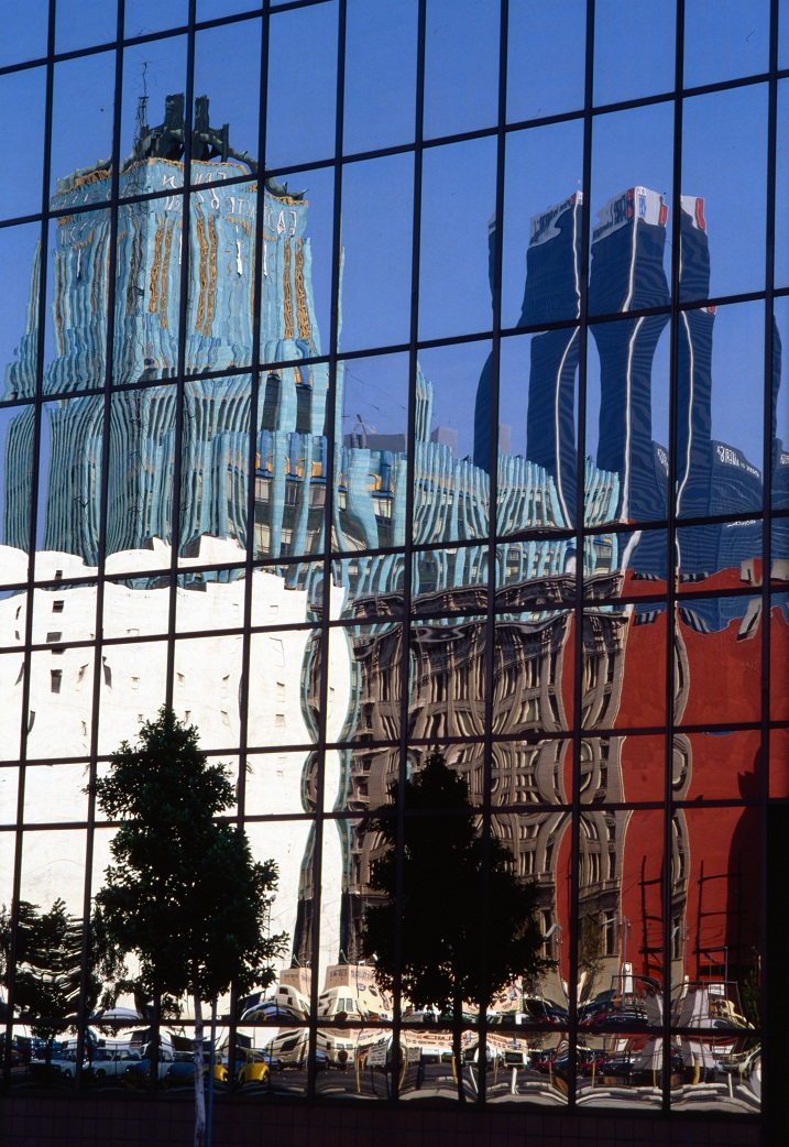 Some of my earlier photographs were take in downtown Los Angeles. I became fascinated by the reflections of the downtown landscape reflected in the reflective glass that is used on many of the buildings. One set of photographs came from reflections from a building where the glass bowed out to produce photographs that I call the LA Quake because it is my impression of LA when the really big one hits.